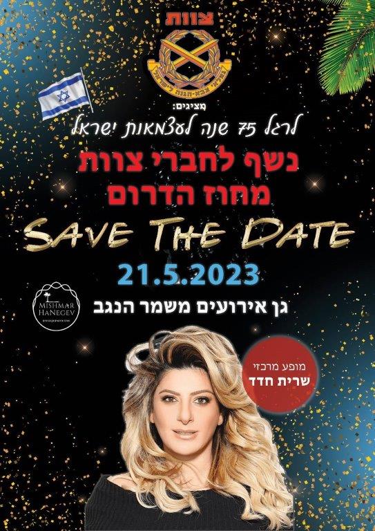 Save the Date: נשף עצמאות לחברי מחוז דרום לרגל 75 שנה לעצמאות ישראל יתקיים ביום ראשון, 21.5.23, בגן האירועים משמר הנגב. המופע המרכזי: שרית חדד