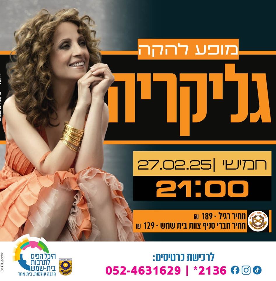 במסגרת שיתוף פעולה עם היכל התרבות בית שמש מוזמנים למופע של הזמרת גליקריה ולהקתה, במחיר מסובסד של 129 שקל במקום 189
