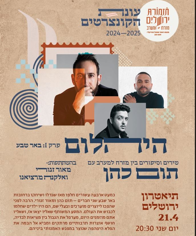 הנכם מוזמנים להופעה של תזמורת מזרח מערב "היהלום" - שירים וסיפורים בין מזרח למערב עם תום כהן, בהשתתפות מאור זגורי ואלקנה מרציאנו, ביום שני, כ"ג ניסן תשפ"ה, 21.4.25, בשעה 20:30, בתיאטרון ירושלים.