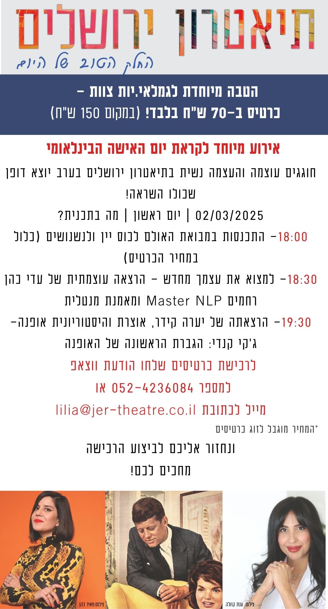 במסגרת שיתוף פעולה עם תאטרון ירושלים חברות המחוז מוזמנות לאירוע מיוחד לקראת יום האשה הבינלאומי, ביום ראשון, 2.3.25, בשעה 18:00.