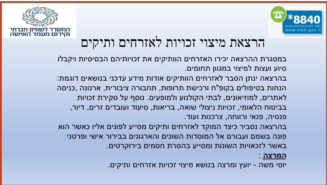 המרצה: יוסי משה - יועץ ומרצה בנושא מיצוי זכויות אזרחים ותיקים.