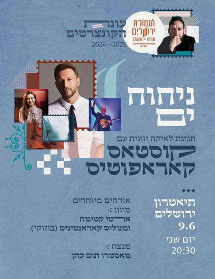 הנכם מוזמנים להופעה של תזמורת מזרח מערב "ניחוח ים" - חגיגת לאיקה יוונית עם קוסטאס קאראפוטיס, ביום שני, 9.6.25, בשעה 20:30, בתיאטרון ירושלים.