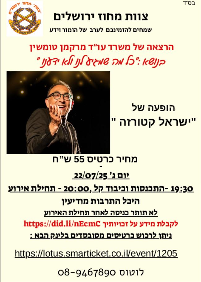 צוות מחוז ירושלים שמחים להזמינכם לערב של הומור וידע, ביום שלישי, 22.7.25, בהיכל התרבות מודיעין. הערב יכלול הרצאה של משרד עו"ד מרקמן טומשין בנושא "כל מה שמגיע לנו ולא ידענו" והופעת סטנד-אפ של ישראל קטורזה.