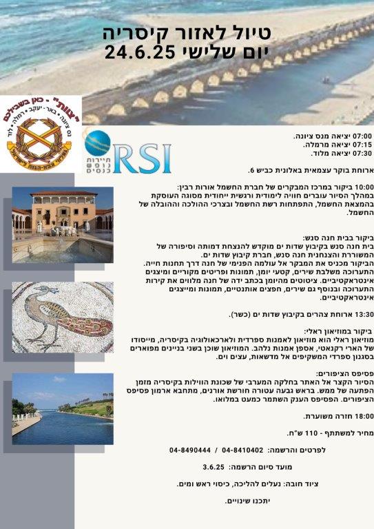 ביום שלישי, 24.6.25, נצא לטיול שיכלול ביקור באתר חברת החשמל "אורות רבין" בחדרה, ביקור בבית חנה סנש בקיבוץ שדות ים, ביקור במוזיאון ראלי ופסיפס הציפורים בקיסריה.