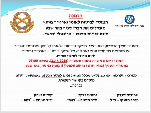 המפגש יתקיים ביום שני, 21.7.25, בשעות 9:00-12:00, במשרדי הסניף, רחוב וולפסון 6 באר שבע.