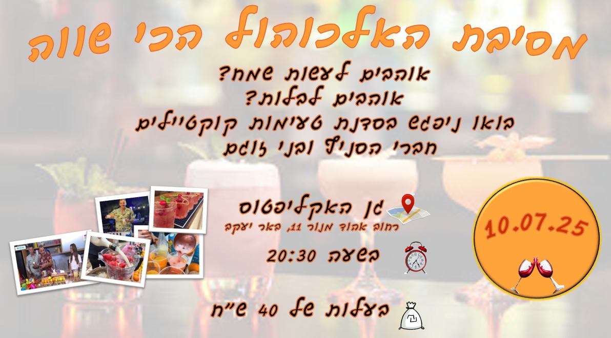 ביום חמישי, 10/7/25, בשעה 20:30, יקיים הסניף ערב קוקטיילים חוויתי. נלמד לשקשק ולערבב, נצא עם מתכוני קוקטיילים מומלצים, יהיו משחקים היתוליים, כיבוד ומוזיקה, חוויה ממש.