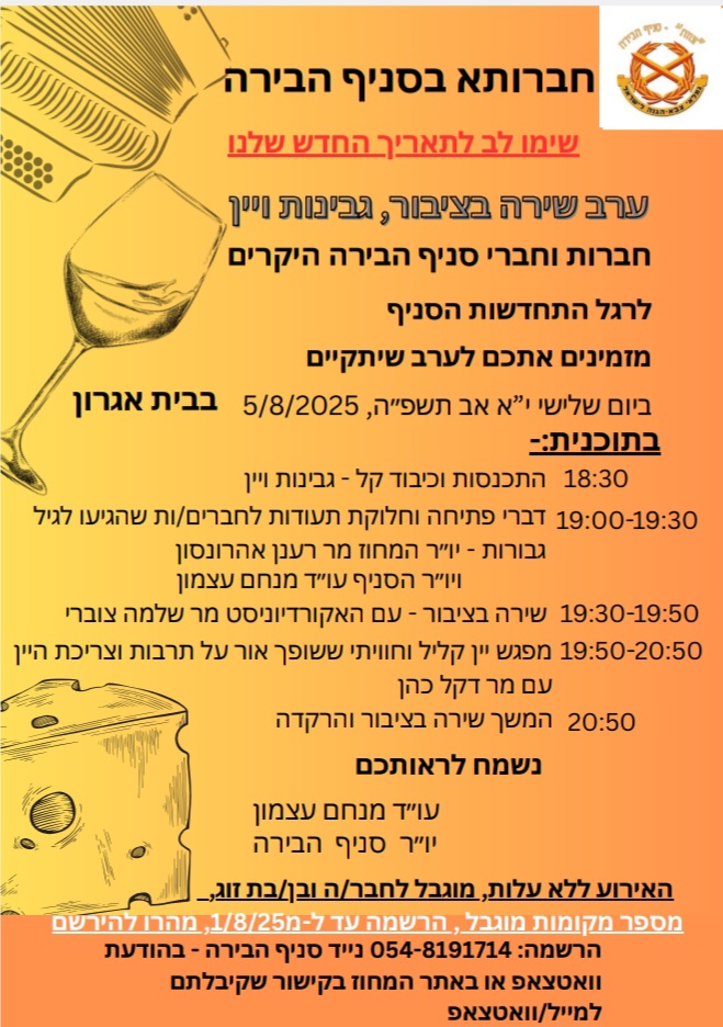 שימו לב לתאריך החדש - המפגש יתקיים ביום שלישי, י"א באב תשפ"ה, 5.8.25, בשעה 18:30, בבית אגרון.