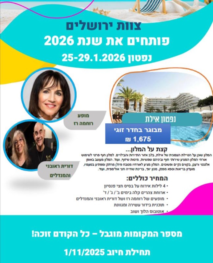 עלות לזוג 3,350 ש"ח ניתן לשלם ב-4 תשלומים ללא ריבית תחילת חיוב 1.11.25.