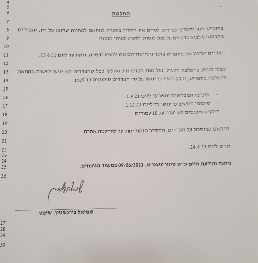 ביום 9.6.2021 התקיים דיון בבית המשפט בסוגיית המיסוי (סעיף 190) מול רשות המסים. לפניכם מצורפת החלטת בית המשפט, המכוון לניסיון נוסף ואחרון להשגת פשרה בין הצדדים וקובע לוחות זמנים להגשת סיכומים במידה שלא תושג פשרה כזו.