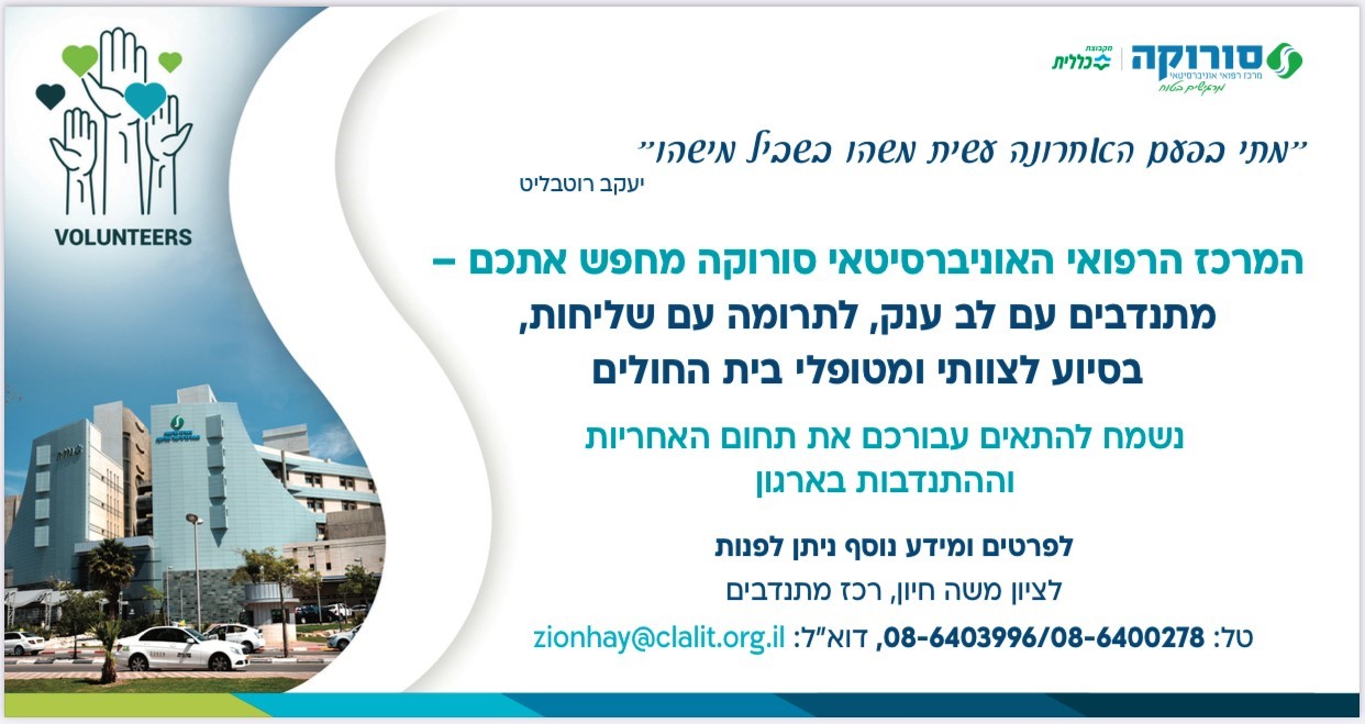 דרושים מתנדבים בבית חולים "סורוקה" לתרומה עם שליחות