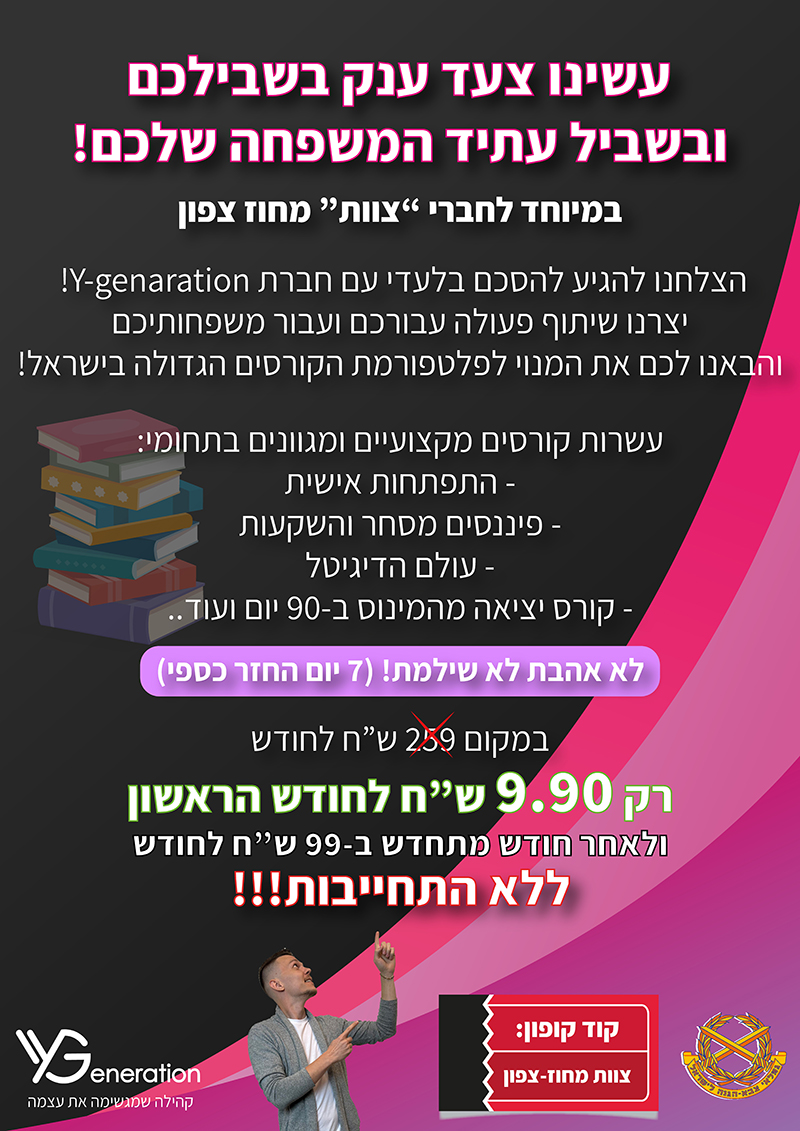 הגענו להסכם בלעדי עם חברת y-generation - מנוי לפלטפורמת הקורסים הגדולה בישראל, המציעה עשרות קורסים מקצועיים ומגוונים בתחומים: התפתחות אישית, פיננסים, מסחר והשקעות, עולם הדיגיטל, יציאה מהמינוס ב-90 יום ועוד.