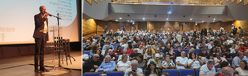 מנהל המחוז שמעון מלכה מברך את הקהל הרב שהגיע להיכל התרבות במעלה אדומים