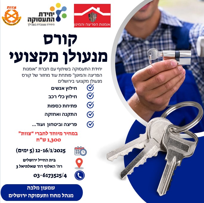 יחידת התעסוקה של "צוות" בשיתוף חברת "אומנות הפריצה והמיגון" פותחת מחזור נוסף של קורס מנעולן מקצועי בירושלים.