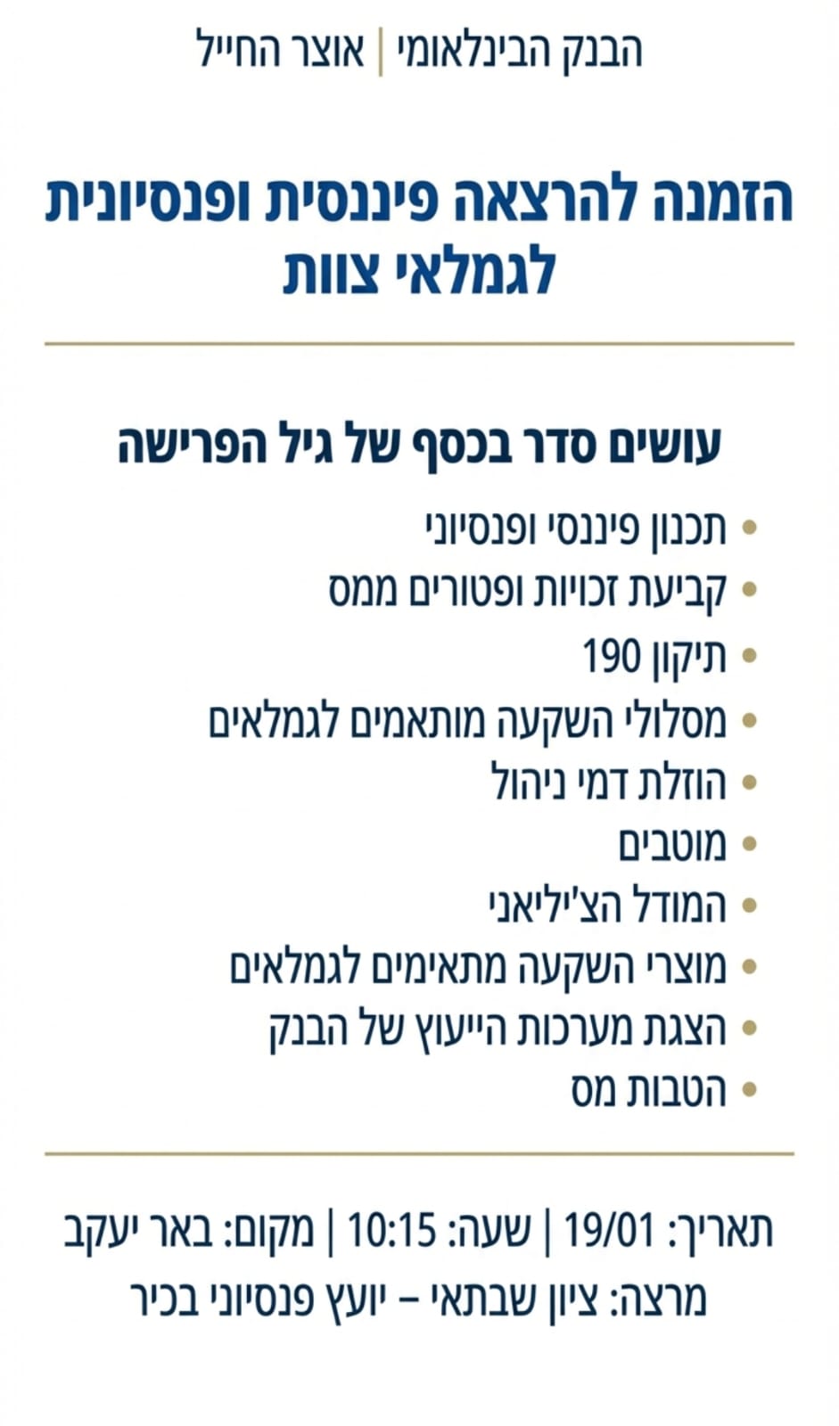 התקיימה הרצאה בנושא פיננסים לחברי הסניף שלנו, ההרצאה התקיימה בבאר יעקב והועברה על ידי מר ציון שבתאי יועץ פנסיוני בכיר של בנק אוצר החייל והבנק הבינלאומי.
