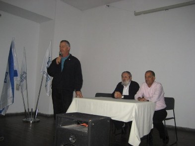 בתמונה העליונה: על הבמה נואם יער ארז, מנהל מרחב מרכז בית החייל י-ם. יושבים: הרב יוסף וסרמן – יו"ר המחוז ושמעון מלכה, מנהל המחוז.