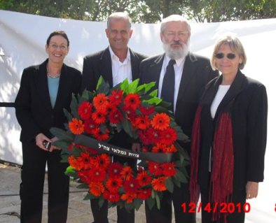 מימין לשמאל: צביה פריד- מנהלת אגף הנצחה והסברה ב"יד ושם" וגמלאית של "צוות", הרב יוסף וסרמן- יו"ר המחוז, שמעון מלכה- מנהל המחוז, רחל ברקאי- מהיכל השמות ב"יד ושם" וגמלאית של "צוות", עם הזר שהונח בשם "צוות"