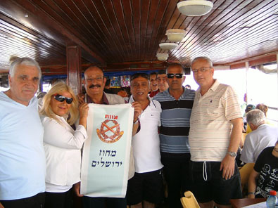 בתמונה: שני מימין שמעון מלכה מנהל המחוז, מחזיק שלט "צוות" – יצחק צרפתי חבר המחוז. ברקע חברי המחוז ונציגי גמלאים שהשתתפו בשיט