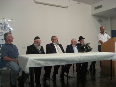 בתמונה מימין לשמאל: שמעון מלכה, הרב יוסף הראל, הרב מרדכי פירון, הרב יוסף וסרמן, הרב יעקב שפירא ויער ארז.