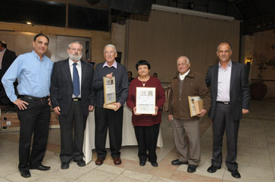 חברי המחוז שהגיעו לגיל גבורות. מימין לשמאל: שמעון מלכה מנהל המחוז, ארמנד דבדה, לאה שקדי, יעקב להד, הרב יוסף וסרמן- יו"ר המחוז, דן נדיב- מנכ"ל "צוות"