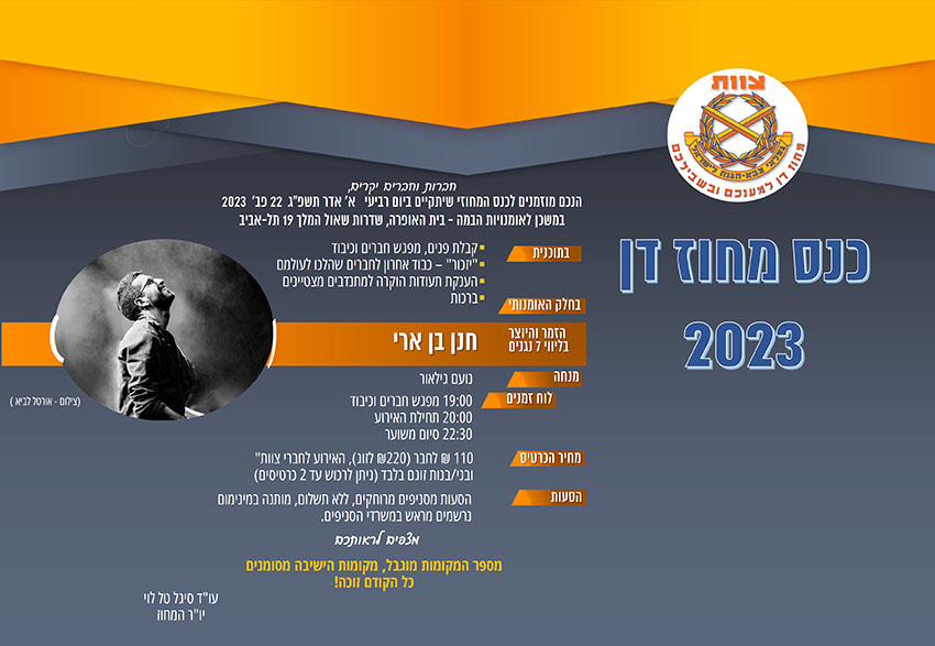 חברי מחוז דן מוזמנים לכנס המחוזי, שיתקיים ביום רביעי, א' אדר תשפ"ג, 22.2.2023, במשכן לאמנויות הבמה - בית האופרה, שדרות שאול המלך 19, תל אביב.