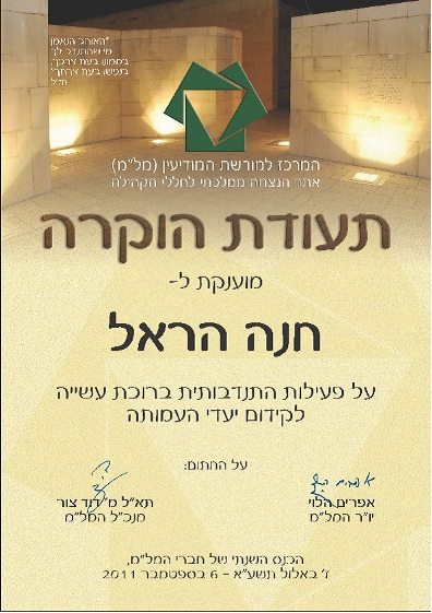 חנה הראל מקבלת את תעודת ההוקרה. למטה: תעודת ההוקרה