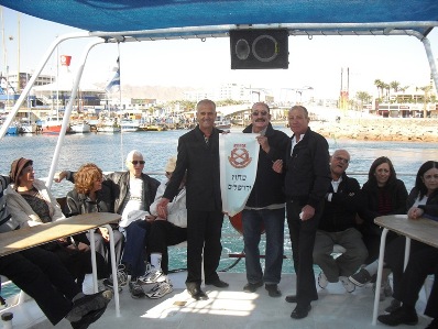 בתמונה: בספינת השיט מימין לשמאל החבר רחמים הררי, צרפתי יצחק ושמעון מלכה-מנהל המחוז מחזיקים בגאווה את שלט "צוות" מחוז ירושלים