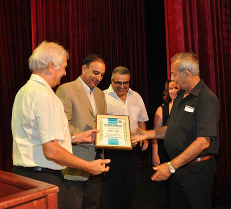 בתמונה: אבי תלם מקבל תעודת הוקרה מידי דן נדיב מנכ"ל צוות