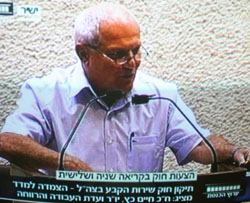 מימין: לוח תוצאות ההצבעה. משמאל: יו"ר ועדת העבודה, רווחה ובריאות ח"כ חיים כץ מציג את החוק במליאה