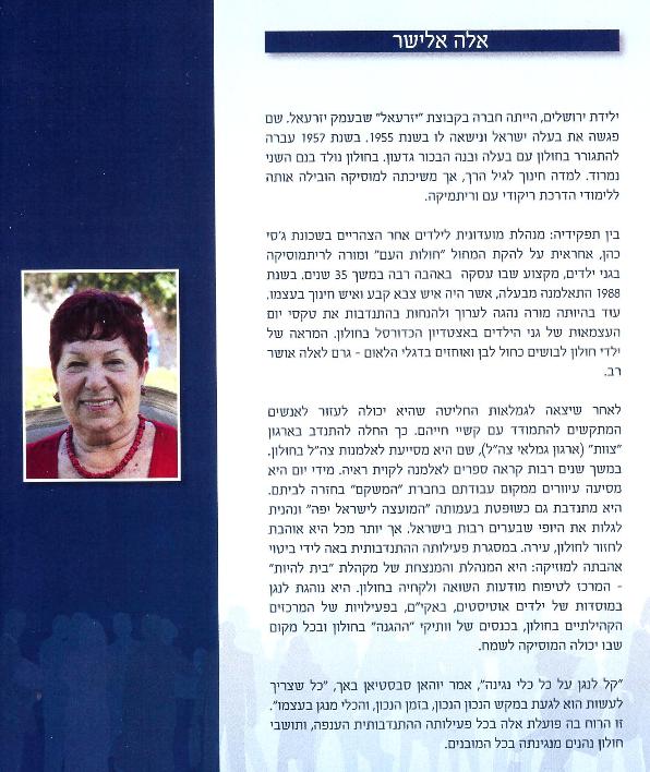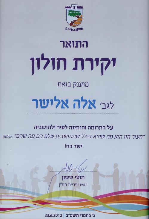 אלה הומלצה לא רק ע''י ''צוות'' סניף חולון, כי אם גם על ידי מספר עמותות נוספות כזכאית לקבלת תואר יקירת חולון.