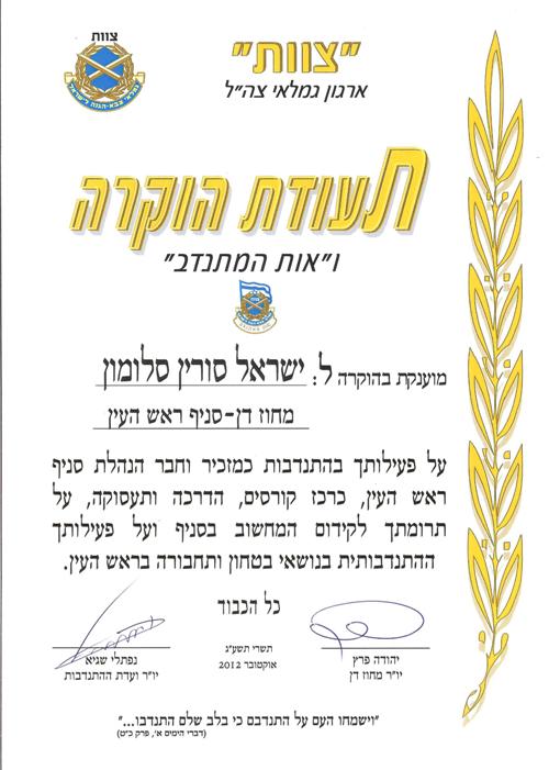 ב-10 באוקטובר נערך כנס מחוז דן שבמסגרתו הוענקו תעודות הוקרה לפעילים ומתנדבים מכל הסניפים. במסגרת זאת זכה ישראל סולומון להוקרה על פעילותו בסניף והתנדבותו בעיר