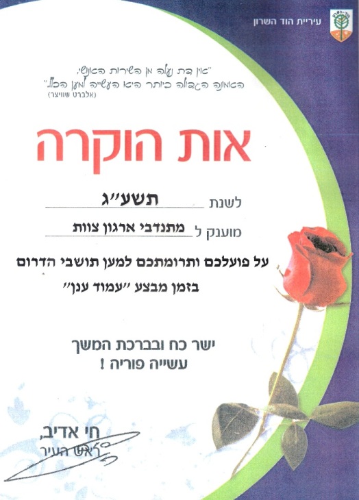 במהלך מבצע "עמוד ענן" תרמו חברי הסניף דברי מתיקה ומוצרי הגיינה שנשלחו לחיילים בדרום. בטקס מרגש העניק ראש העיר תעודת הוקרה לחברי הנהלת הסניף על פעילות החברים למען החיילים במהלך המבצע.