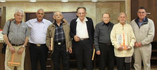 בתמונה מימין לשמאל: מר גדעון שני יו"ר המחוז, מר גבע מרדכי, בן 80, מר פרץ לב יו"ר ועדת בני 75+, מר אליעזר שטרן, בן 80, מר יום טוב צבי, בן 80, מר לוגסי אברהם מנהל המחוז, מר אבירן אליאב, בן 80.