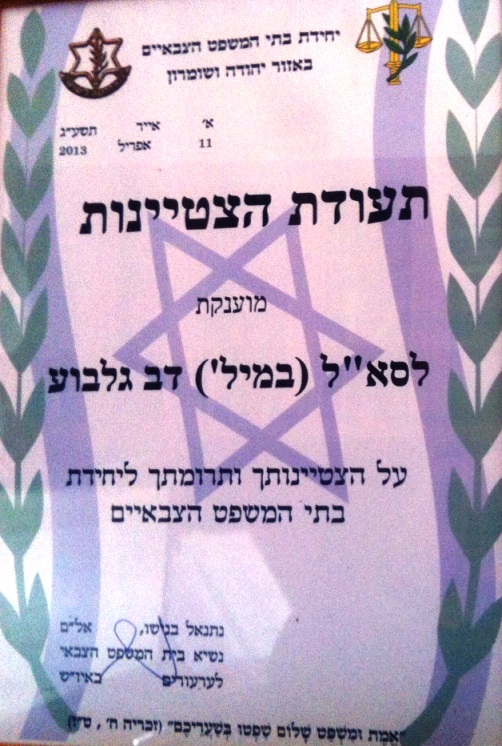 תעודת הצטיינות לשופט סא"ל מיל' דב גלבוע