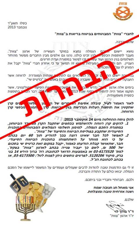 הממונה על הביטוח באוצר קיבלה בימים אלה החלטה להאריך את תוקפו של הביטוח הקולקטיבי עד לסוף שנת 2014. לאור זאת בכוונתנו להעלות להצבעה באסיפת הנבחרים הקרובה, שתתקיים ב-25 בדצמבר 2013, החלטה לפיה יועברו כספי קרן הרווחה, אשר יועדו להבטחת המשכיות הביטוח הסיעודי, לחברים. לאמור, לאשר הענקת סך של 500 ₪ לכלל החברים, גם לאלו המבוטחים בביטוח הבריאות של "צוות".