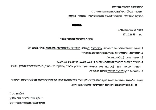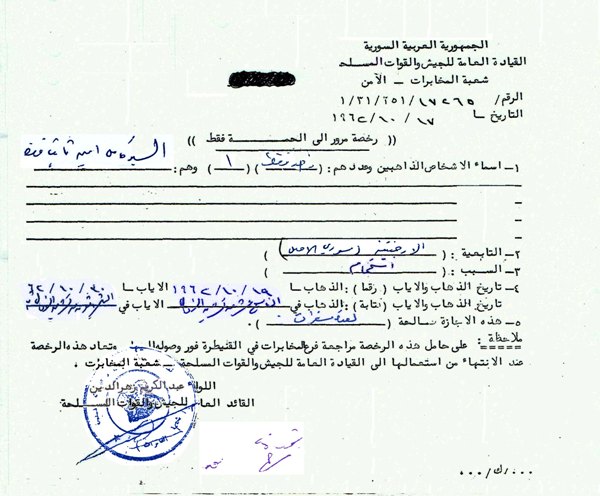 אישור הכניסה של אלי לאל-חמה שברמת הגולן חתומה ע"י הרמטכ"ל הסורי עבד אל כארים זהר אל דין והתרגום שלה לעברית