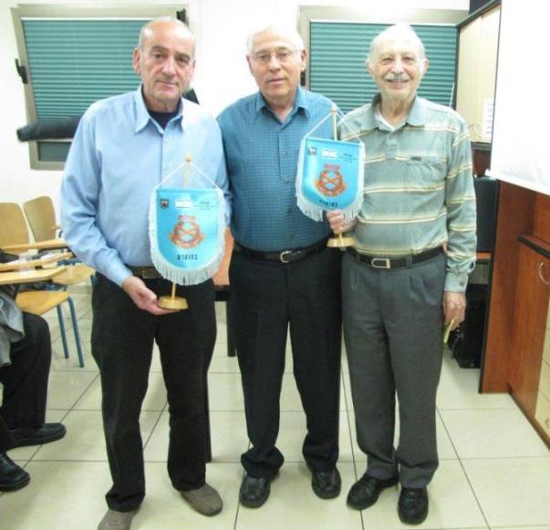 יוסי פורת, יו"ר סניף "צוות" רמת גן (במרכז), מעניק דגלוני הוקרה של הסניף לאברהם כהן, האח (משמאל) ולנתן סלומון (מימין), המדריך האישי של אלי כהן הי"ד
