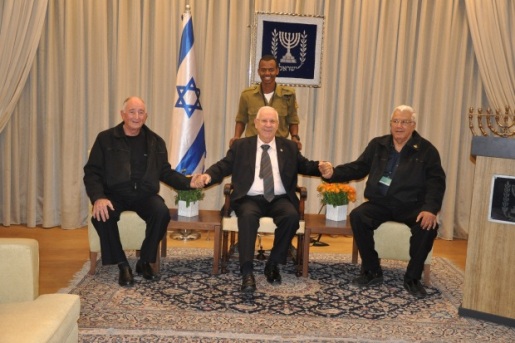 משלבים ידיים. (משמאל) תא"ל (מיל) צידון, הנשיא ריבלין אל"מ (מיל) כנען. עומד מאחור מהרט בלאי
