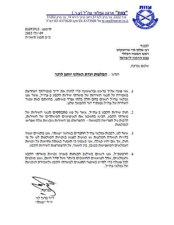 יו"ר "צוות" ד"ר ברוך לוי העביר לרמטכ"ל גדי אייזנקוט מכתב בנושא המלצות ועדת האלוף יוחנן לוקר המחזק את ידיו בעמידה הנחרצת על זכויות משרתי הקבע וקורא לו להפגין אותה נחישות בשמירה על זכויות הגמלאים