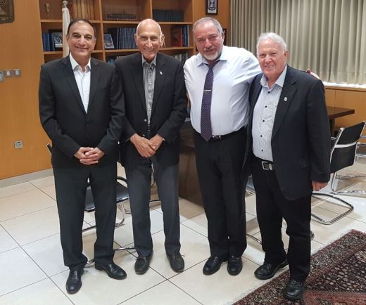 מימין: יו"ר "צוות" מוטי בר-דגן, שר הביטחון אביגדור ליברמן, נשיא כבוד "צוות" ברוך לוי והמנכ"ל דן נדיב