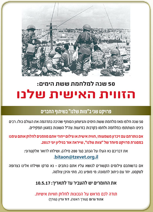 חברים המעוניינים להירתם ולהתנדב לפרויקט זה יפנו ללשכת מנכ"ל "צוות" בטלפון: 03-6173506.