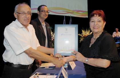 אלה אלישר מקבלת את האות מידי ראש עיריית חולון מוטי ששון